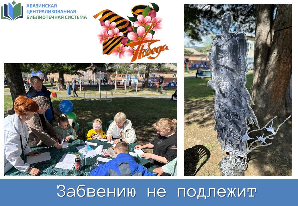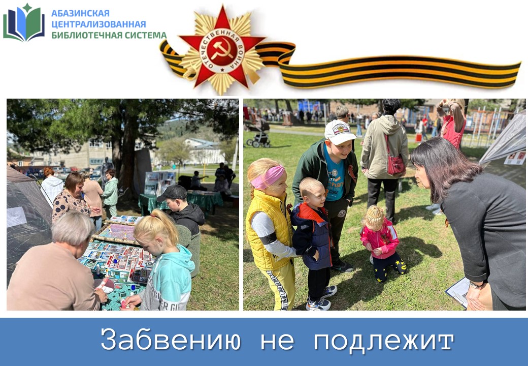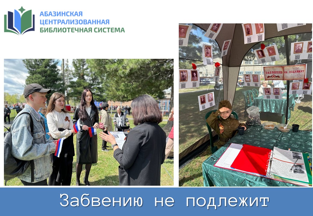 9 мая библиотеки города Абазы представили свою интерактивную площадку «Забвению не подлежит» на мероприятиях, посвященных 79-ой годовщине со Дня Победы в Великой Отечественной войне 1941 — 1945 годов.