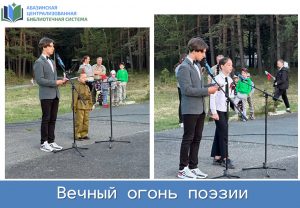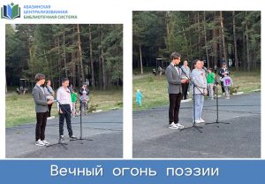 Вечером, традиционно уже в 7 раз, прошла акция «Вечный огонь поэзии», в которой принимали участие чтецы из театральных коллективов «ДрамТАМ», «Сияние», школьного театра «Премьера», а также ученики школ и воспитанники детских садов города Абазы. Очень проникновенно прочла стихотворение Наталья Ивановна Тудвасова, участник литературного клуба «Элита».