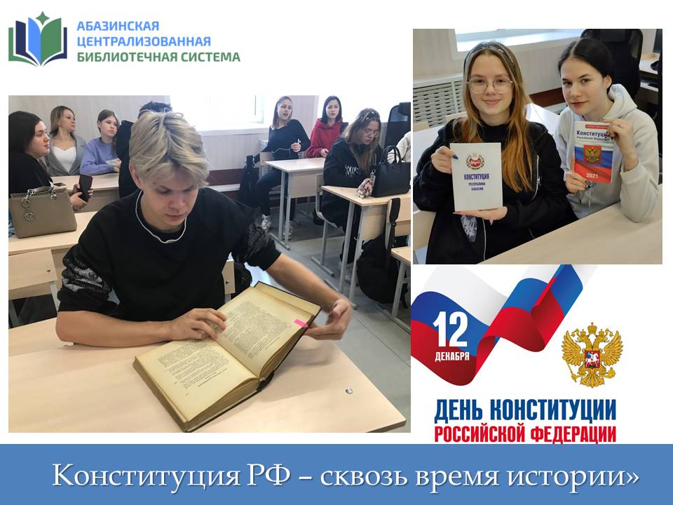 🗒13 декабря сотрудники городской библиотеки провели час правовых знаний «Конституция РФ – сквозь время истории» для студентов Черногорского горно-строительного техникума — филиала в г. Абазе.