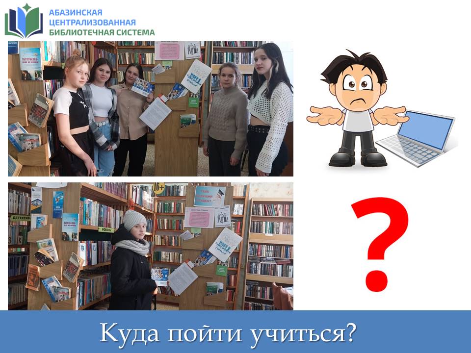 25 января в библиотеке Абазы – Заречной прошла беседа, для старшеклассников, у информационного стенда «Куда пойти учиться?». Школьникам рассказали, насколько важен выбор профессии, что это один из серьезнейших шагов. Отвечает ли выбранная профессия интересам и способностям человека, является ли востребованной на рынке труда, дает ли возможности для карьерного роста, от всего этого зависит вся дальнейшая жизнь будущих абитуриентов.