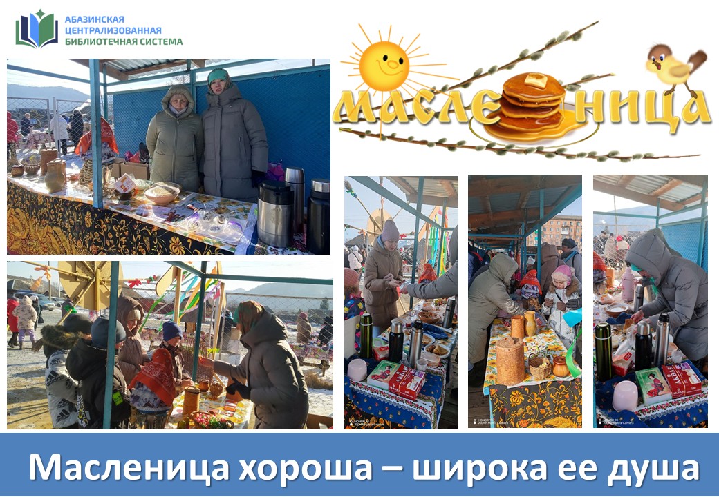 Широкие народные гуляния «Масленица идёт, блин да мёд несёт» прошли в городе Абазе. Свою праздничную программу представили городские библиотеки 22 февраля на Рыночной площади!