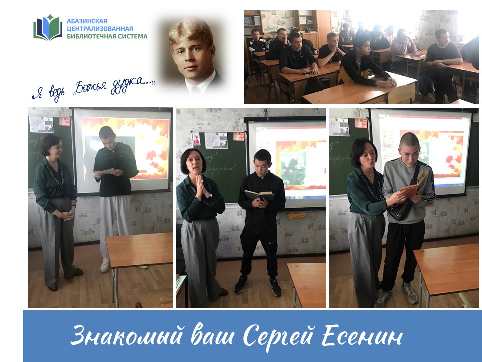 Заведующий городской библиотекой посетила урок литературы в Черногорском горно-строительном техникуме-филиале в городе Абазе и провела для студентов первого курса путешествие в многогранный мир творчества гения русской литературы. Юлия Николаевна познакомила ребят с биографией поэта Есенина. За свою короткую жизнь Сергей Александрович успел вдохновить множество женщин, писателей, художников и музыкантов. Нужно отметить, что до сих пор его произведения будоражат умы современников.