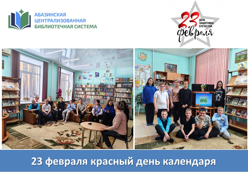 20 февраля, накануне праздника, в библиотеке Абазы-Заречной состоялась викторина «23 февраля — красный день календаря», посвящённая мужеству и отваге защитников Отечества.